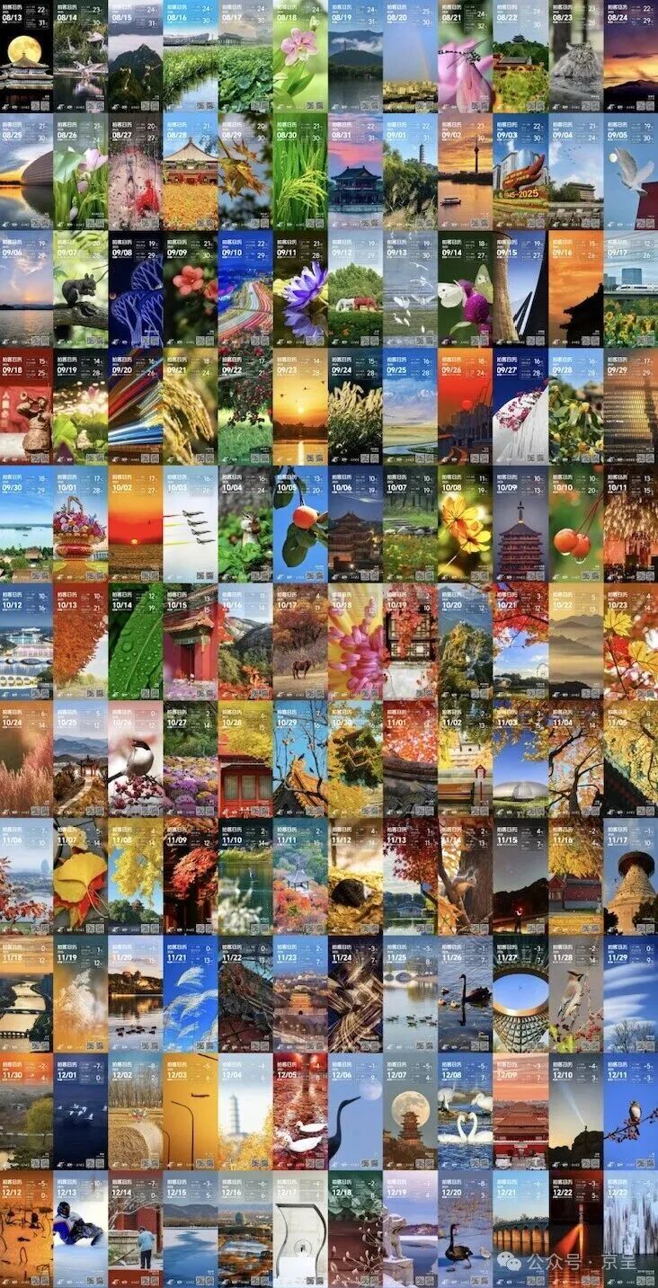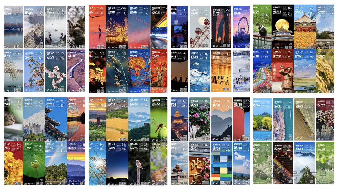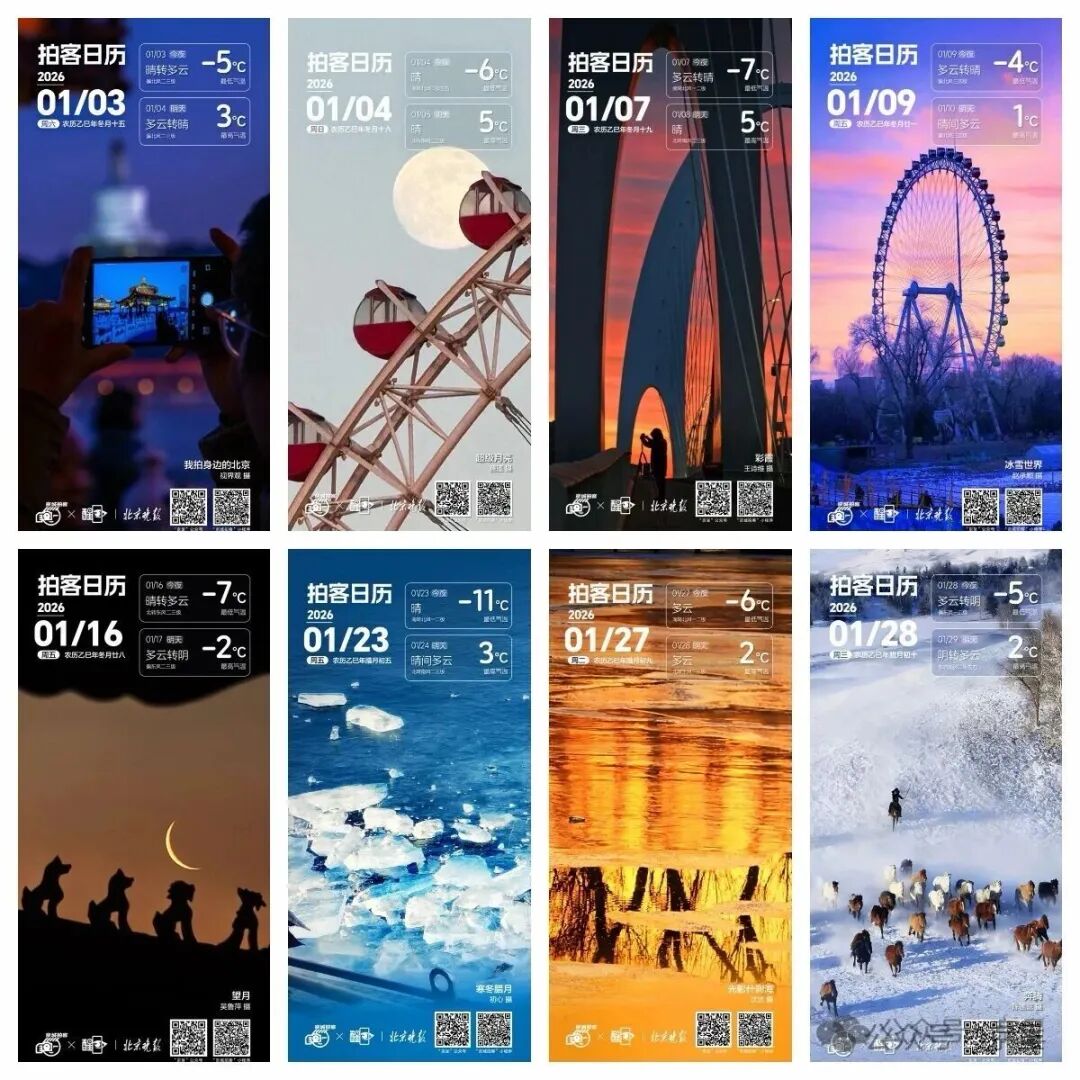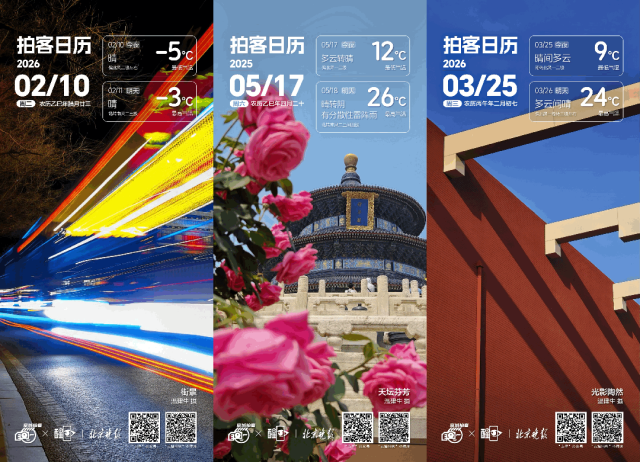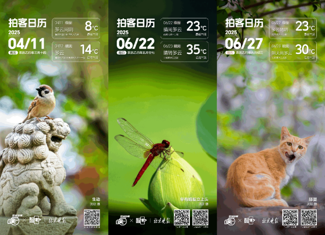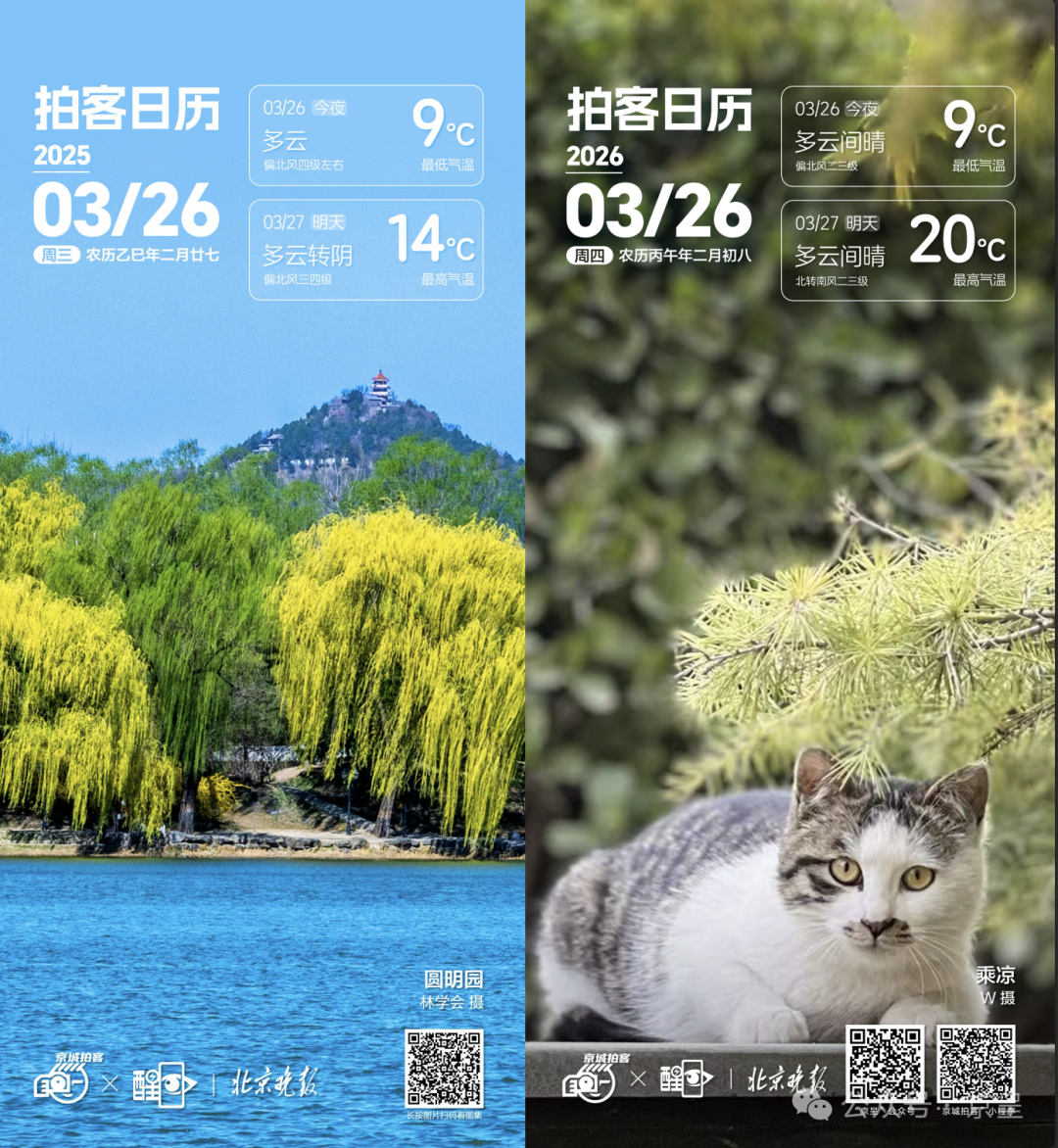 2025年3月26日起,我们开始尝试每天从众多投稿中挑选与当天日期、气象、风物相关的照片,经过美术编辑妙手设计,制作成一幅日历。并逐渐衍生出无字版手机壁纸,添加京城拍客小程序、公众号等实用信息及链接,便于读者使用。更新一年来,已有超过二百位作者的作品入选。