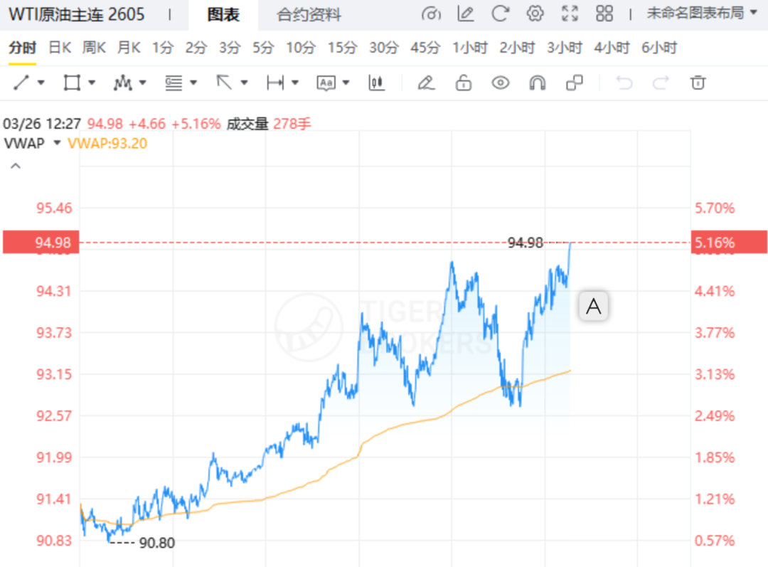 截至3月27日00:27,WTI原油期货涨幅扩大至5%,报94.902美元/桶。