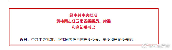 近日,中共中央批准:黄祎同志任云南省委委员、常委和省纪委书记。