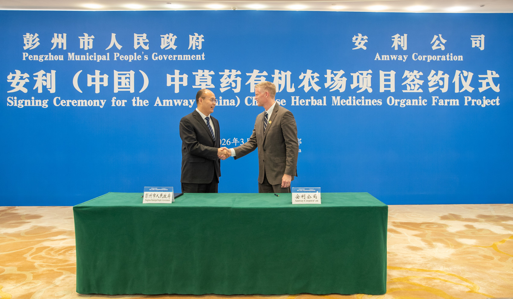 3月26日,安利(中国)中草药有机农场项目在成都市正式签约。根据协议,安利(中国)中草药有机农场项目将落户成都彭州市,投资总额约3500万美元,其中外商直接投资(FDI)不低于1000万美元,固定资产投资额不低于2000万美元。