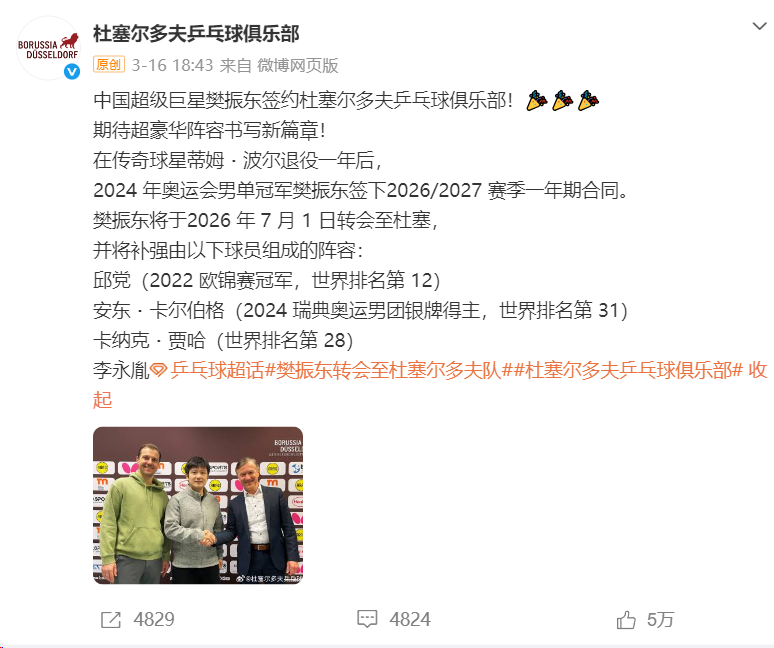 3月16日,杜塞尔多夫乒乓球俱乐部官宣樊振东加盟: