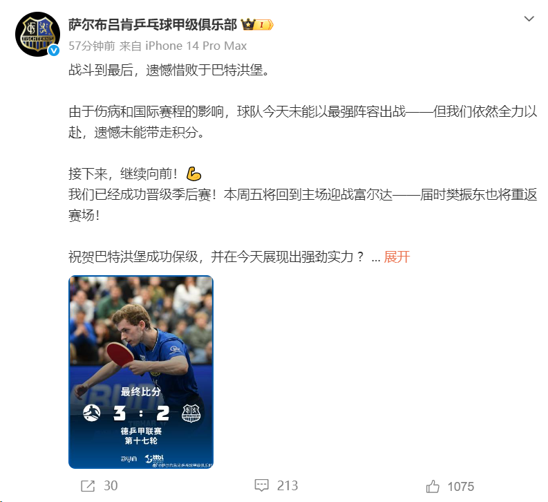 3月26日,@萨尔布吕肯乒乓球甲级俱乐部 发布微博:我们已经成功晋级季后赛!本周五将回到主场迎战富尔达——届时樊振东也将重返赛场。