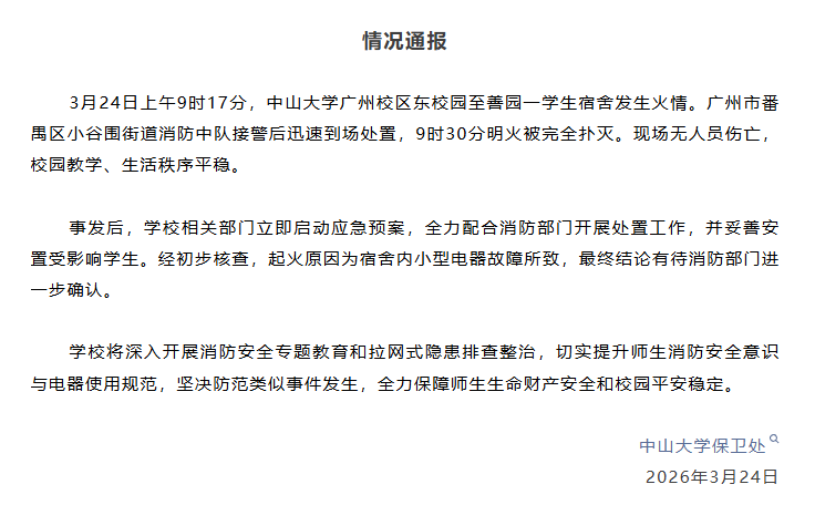 起火原因为宿舍内小型电器故障所致