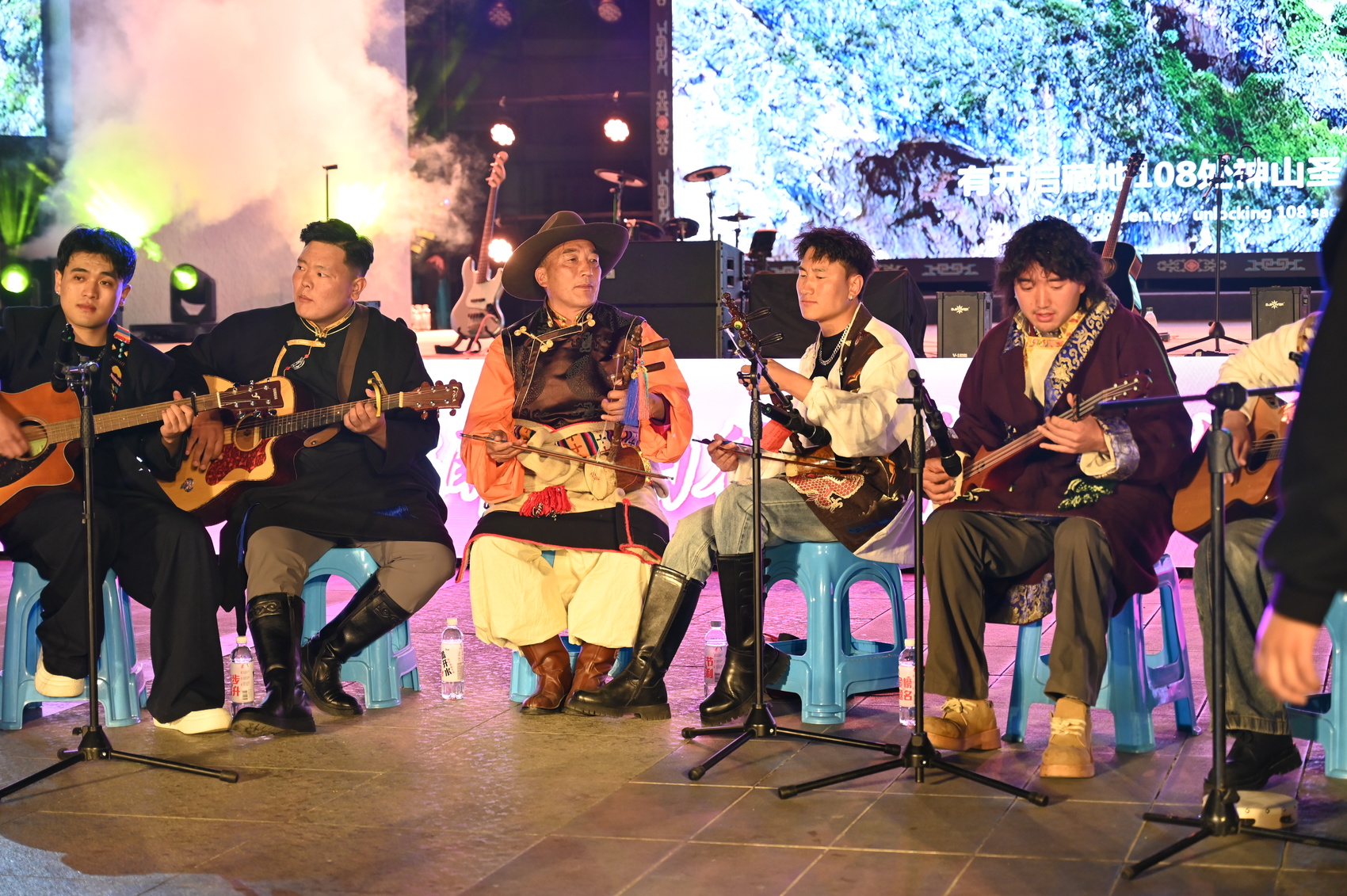 现场,得荣本土音乐人组成的乐队以经典民歌为基底,融入现代编曲手法,一首首耳熟能详的曲目被重新诠释——既有传统的深沉悠远,又不失当下的灵动鲜活。主唱用藏汉双语交替吟唱,吉他、弦子与打击乐交织共鸣,台下观众或轻声跟唱,或随节奏摇摆,音乐跨越年龄与代际,成为连接情感的共同语言。