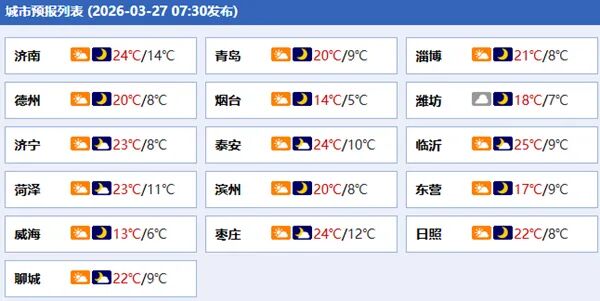 27日下午到28日白天,全省天气晴转多云。鲁西北、鲁中和半岛地区北风3~4级转南风4级阵风5~6级,其他地区南风3~4级。