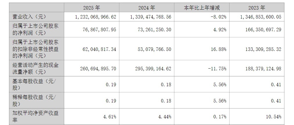 据久远银海最新发布的2025年年报显示,公司去年实现营业收入12.32亿元,同比下降8.02%;实现归母净利润7686.78万元,同比增长4.92%;实现扣非净利润6204.08万元,同比增长16.88%。基本每股收益为0.19元,加权平均净资产收益率为4.61%。公司2025年度分配预案为:拟向全体股东每10股派现1元(含税)。