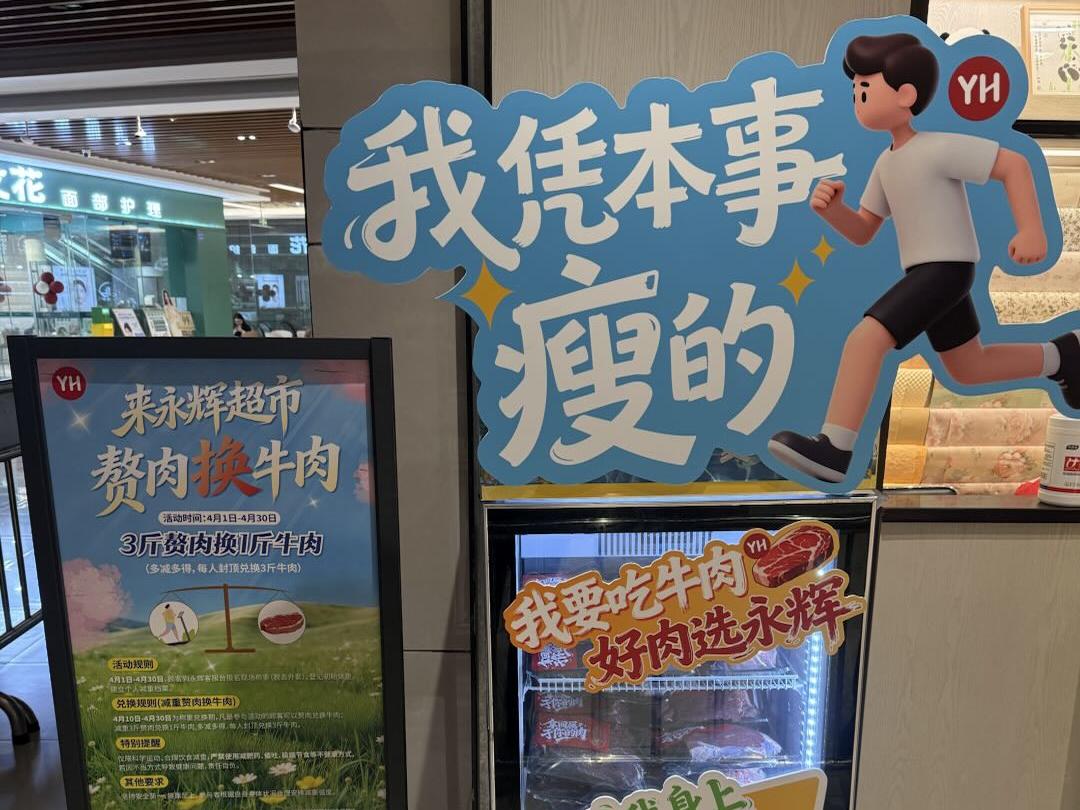 记者注意到,在成都永辉超市线下门店——成都锦江文华店、武侯吾悦店、金牛北城龙湖店、成华青龙店等,已在身高体重测量仪上张贴“赘肉换牛肉”相关活动标识,多家门店的牛肉、小龙虾等生鲜区域也布置了相关海报,活动预热氛围浓厚。