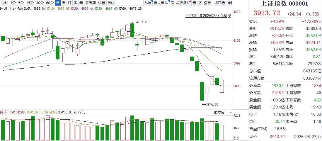 周五,上证指数低开高走,盘中在站上5日均线后反弹有所加速,收盘再回3900点整数关口上方。深证成指同样是低开高走,盘中反弹受上方5日均线压制,收盘涨幅有所收窄。