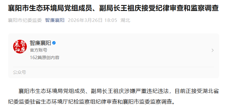 据襄阳市纪委监委通报,襄阳市生态环境局党组成员、副局长王祖庆涉嫌严重违纪违法,目前正接受湖北省纪委监委驻省生态环境厅纪检监察组纪律审查和襄阳市监委监察调查。