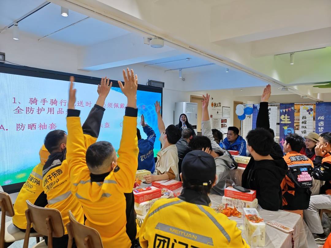 活动现场暖意融融,处处洋溢着轻松与喜悦。在主持人热情洋溢的引导下,“小牛哥”们互致祝福,一句句朴素而真挚的话语,传递着同行之间惺惺相惜的温暖。互动游戏环节精彩纷呈,知识小问答、蒙眼原地踏步、看图猜谐音梗三个趣味项目轮番登场,题目内容紧密结合骑手日常工作和社区志愿服务,既有趣味性,又兼具参与感。无论胜负,参与者都能收获一份小礼品,现场笑声不断,气氛热烈。