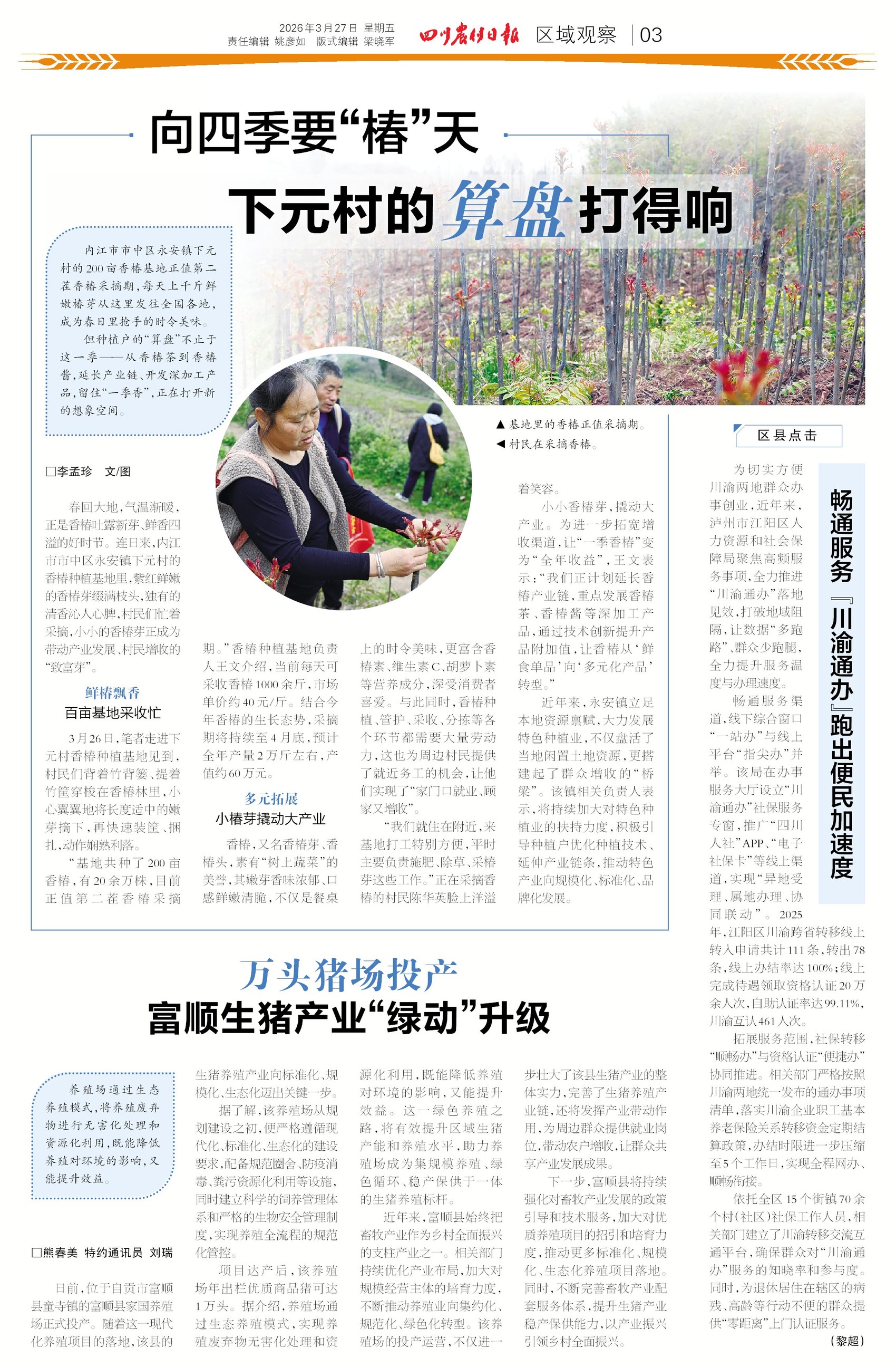 向四季要“椿”天!内江下元村200亩香椿基地,第二茬椿芽正抢“鲜”,每天上千斤发往全国。光卖鲜椿还不够,还要做香椿茶、香椿酱——让“一季香”变“全年赚”。富顺万头猪场也投产了,生态养殖、粪污变肥,助推生猪产业升级!