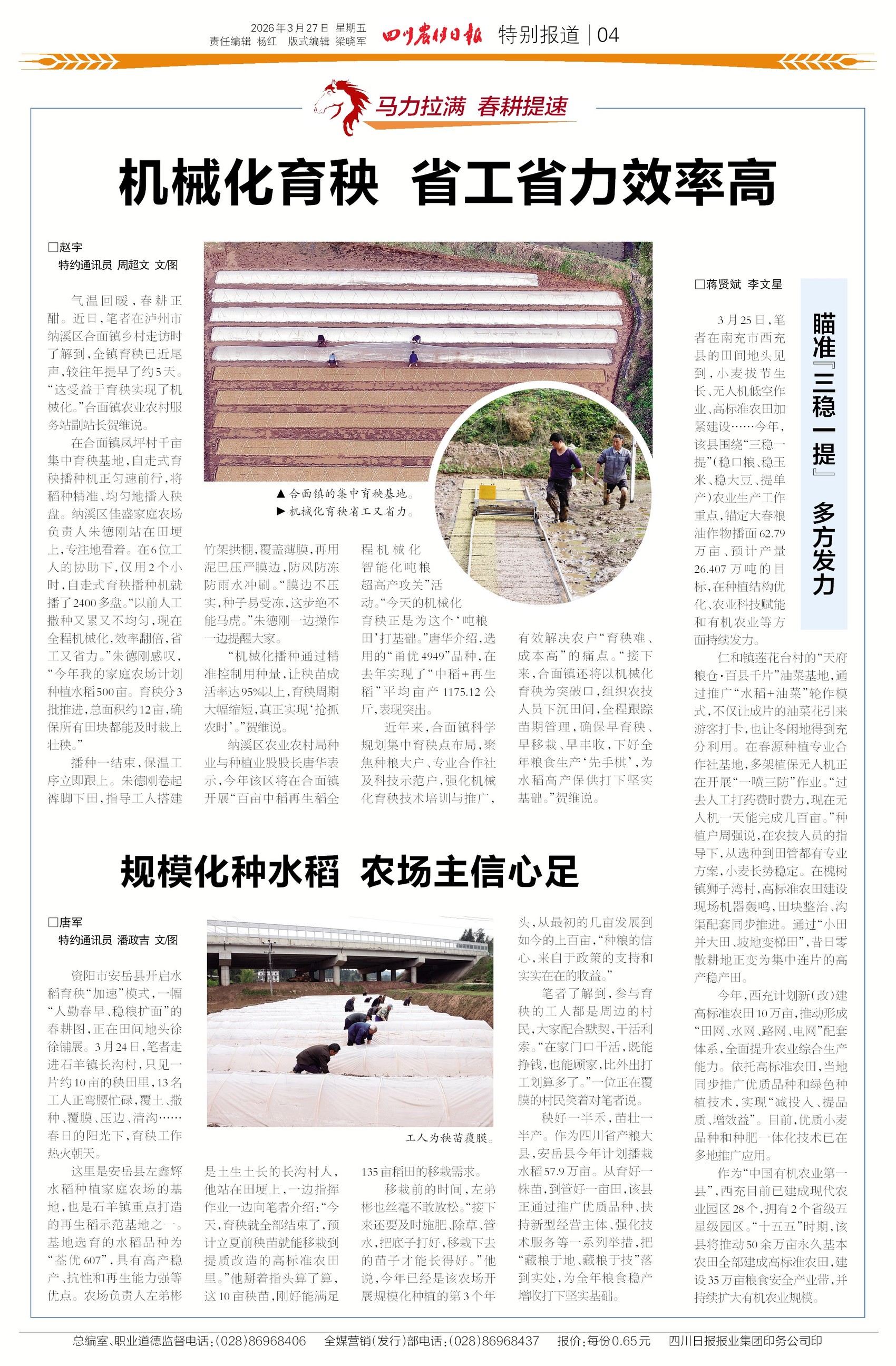 春耕“黑科技”上线!泸州纳溪合面镇,自走式育秧播种机2小时播2400多盘,省工省力效率翻倍。西充县“小田并大田、坡地变梯田”,今年计划新(改)建高标准农田10万亩——从育秧到管护,全程“科技范儿”拉满!