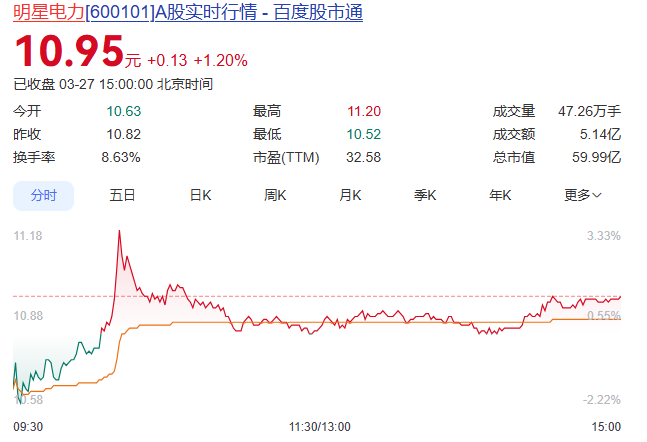 截至3月27日收盘,明星电力微涨1.2%,报10.95元/股,总市值逼近60亿元。
