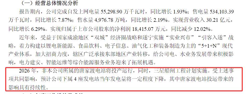 但值得一提的是,2026年,非明星电力所属的唐家渡电站将投产运行,同时,三星船闸工程计划实施。受上述事项共同影响,预计明星电力下属4座发电站当年发电量将一定程度下降,其中唐家渡电站投运带来的影响具有持续性。