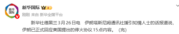 新华社德黑兰3月26日电伊朗塔斯尼姆通讯社援引知情人士的话报道说,伊朗已正式回应美国提出的停火协议15点内容。
