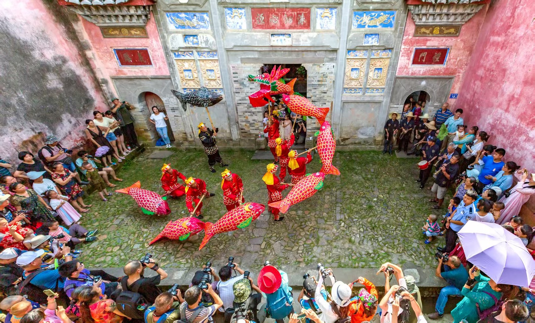 兴贤书院外小广场上的龙鱼戏表演吸引众多游客和居民围观。肖文凤 摄