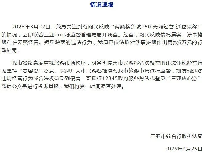 3月25日,海南省三亚市综合行政执法局发布情况通报。针对3月22日网民反映的“两颗榴莲被坑150元、摊贩无照经营及使用遥控鬼秤”等问题,该局当日联合三亚市市场监督管理局开展调查。