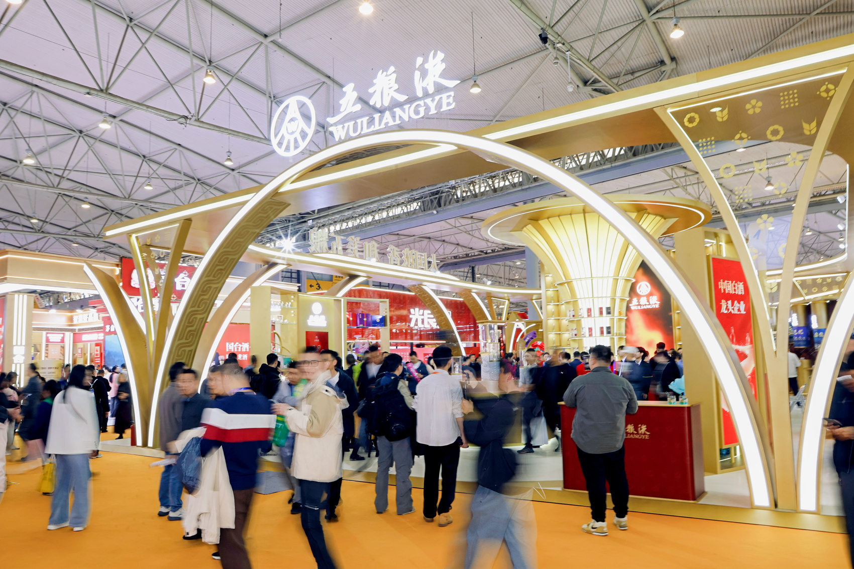 在“和美共聚”C位区域,汇聚的线条形成巨型吸睛结构,支起展台的视觉重点,形成明显可识别的品牌标识,象征着五粮液在行业中坚实的地位,也寓意着对市场合作的兼容并包。