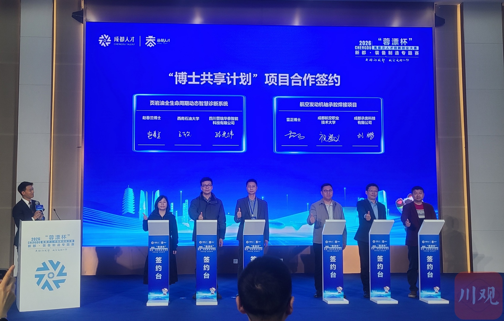 3月25日,2026“百博链企·生态共育”成都市新都区校企供需对接会上,西南石油大学博士赵春兰居左,四川普瑞华泰智能科技有限公司总监孙光伟居右,代表“一校一企一博一签”模式现场签约。赵春兰博士团队将为企业制造的油气设备嵌入“AI大脑”,共同开拓油气田市场。
