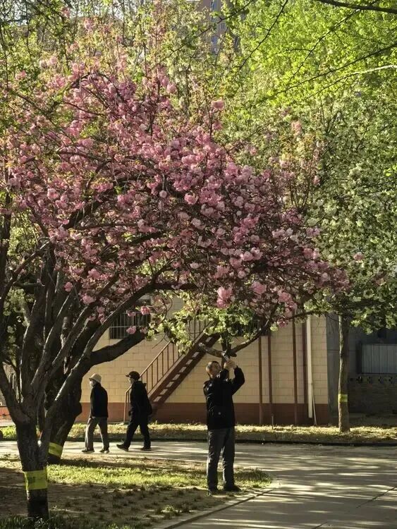 樱花有300多个品种,但大多为白色或粉色,而这绿色的樱花显然与众不同,它是樱花中的珍稀品种,名叫“郁金樱”,在石家庄比较稀少。