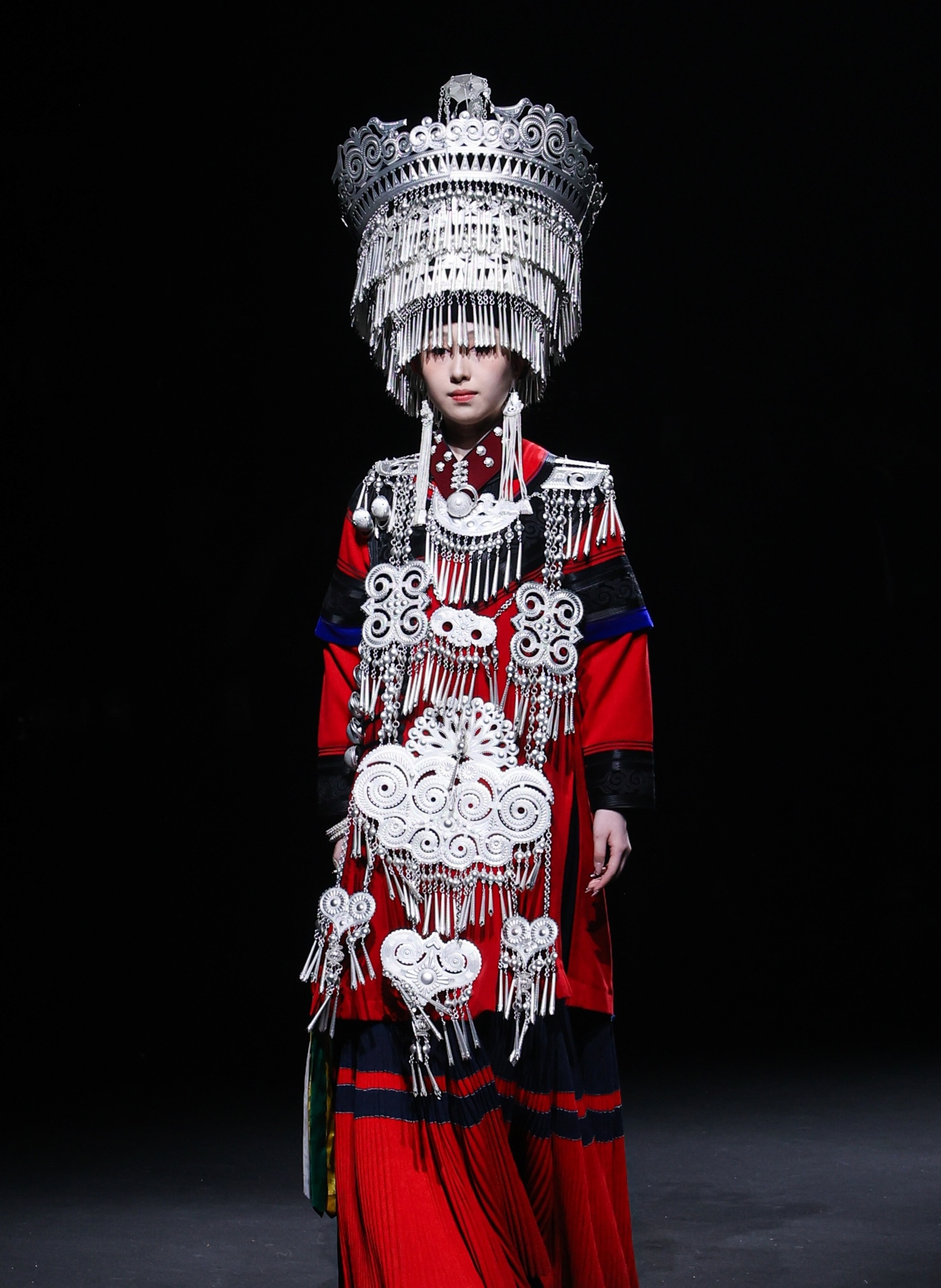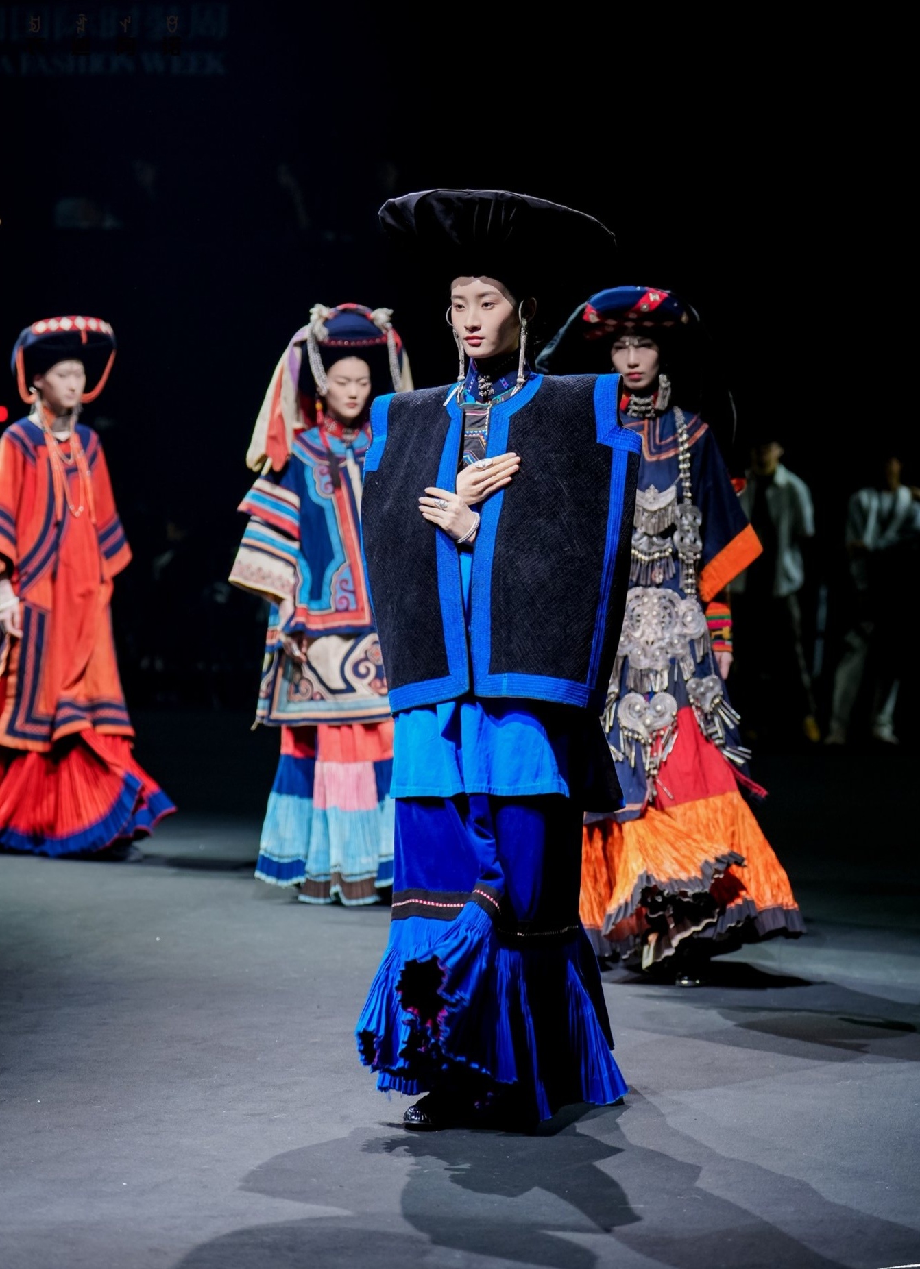 这场专场发布以“源启”“沥火”“新生”三个篇章,将大凉山彝族千年文明织进每一寸面料。“源启”重现传统彝服的宽衣阔毡、日月山川纹样,让创世神话在T台鲜活行走;“沥火”让古老非遗与现代生活碰撞,探索非遗传承的新表达;“新生”则用四十套大地色系创新服饰惊艳全场——马齿纹、火焰纹被提炼为当代图形语言,羊毛花呢、醋酸等现代面料与激光切割、贴布绣等工艺相融,银饰与玛瑙点缀其间,彝族美学精准契合当代审美。