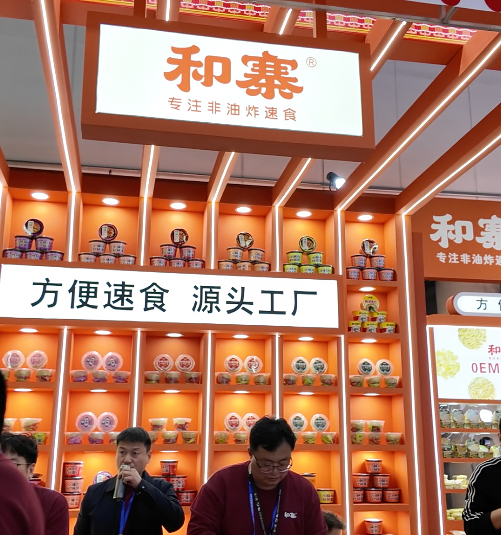 在另一家做非油炸速食企业的展台的展架上,摆满了方便面、方便粉、方便豆皮等方便速食,“源头工厂”几个大字也贴在最显眼的位置。工作人员告诉记者,可以提供各种代加工服务。记者在现场看到,不少企业都展示了为连锁商超或电商平台打造的代工产品或贴牌商品,涵盖方便食品、休闲零食、肉类深加工等全品类代工资源。