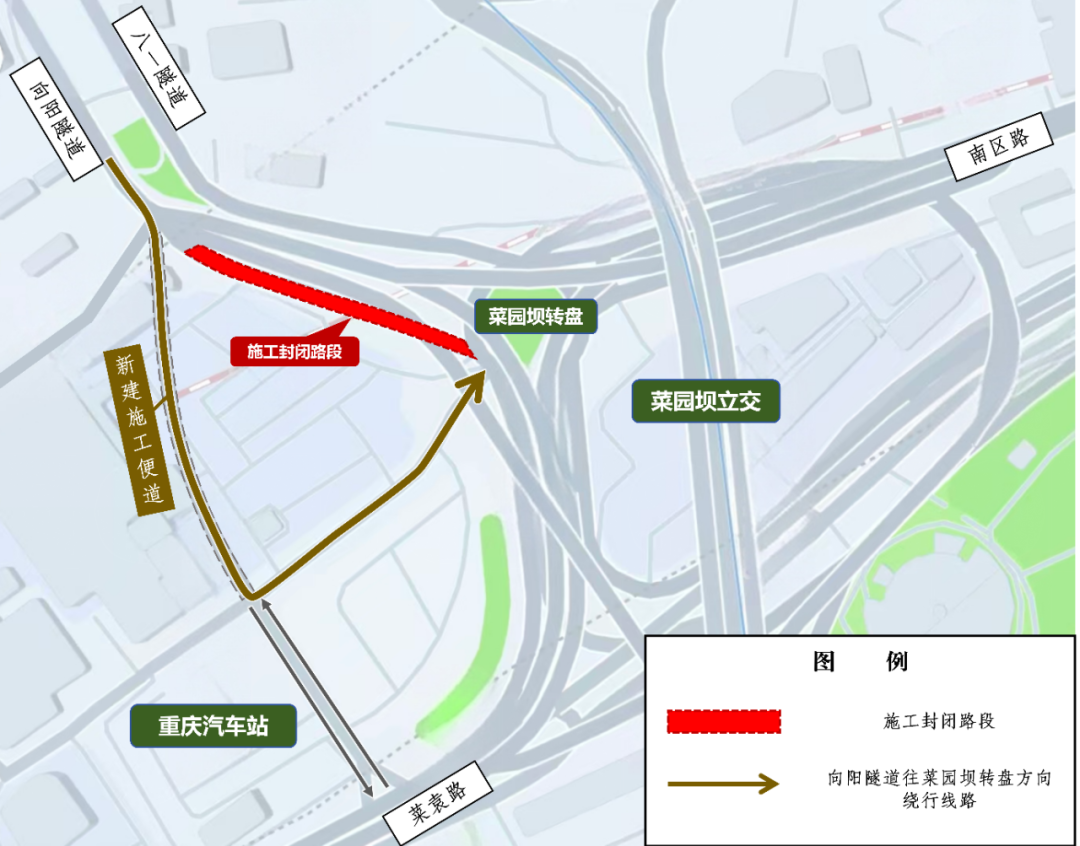 向阳隧道出口往菜园坝立交方向:车辆通过新建施工便道往菜园坝方向行驶;同时调整菜袁路至重庆汽车站路段交通组织为双向通行,允许往菜袁路方向车辆驶出,不再绕行菜园坝转盘。