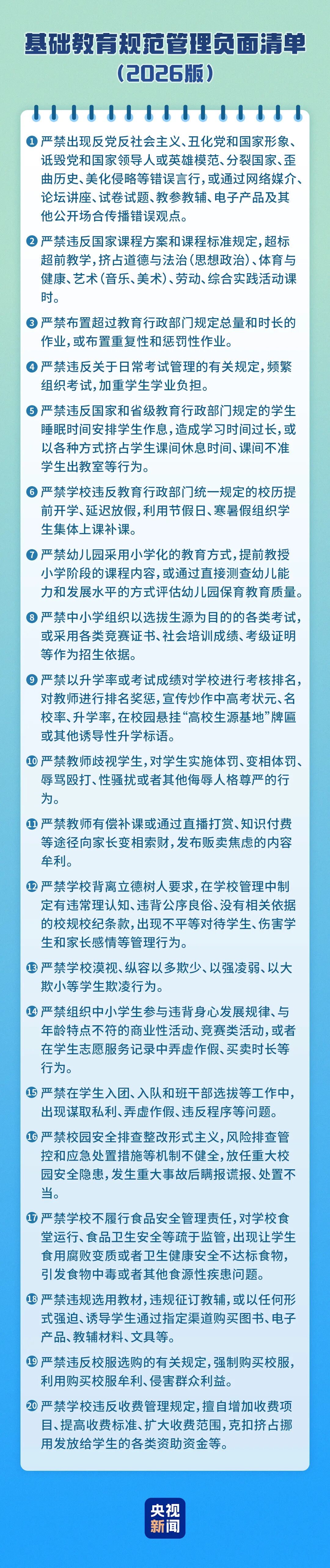 《通知》提出了20条负面清单,围绕影响政治安全、影响教育公平、影响学生身心健康、造成课业负担过重、师德失范、侵害群众利益等六类问题,明确禁止行为。