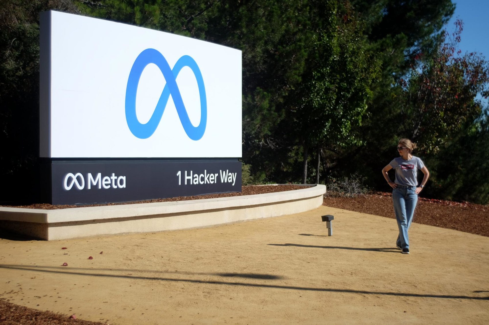 2021年10月29日,在美国旧金山湾区,一名女子站在“元”标志牌前(资料照片)。图据新华社