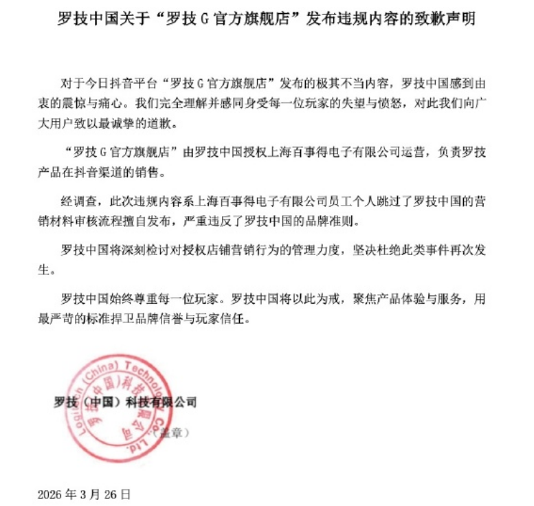 上海百事得电子有限公司也通过抖音账号@罗技 发布了致歉信。其中称,“我们在此郑重承诺,绝不将责任推诿于任何个人或单一团队,我们将正视并承担店铺在管理、监督与价值观传导上的全部责任。”