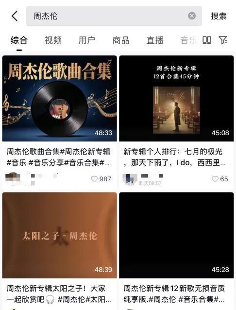 记者发现,在某短视频平台上搜索“周杰伦新专辑”,一些账号除了录屏传播个别曲目外,甚至还有重新整理后,时长为四十多分钟的“合集”,用户只需一键收藏就可以随时随地免费听歌。