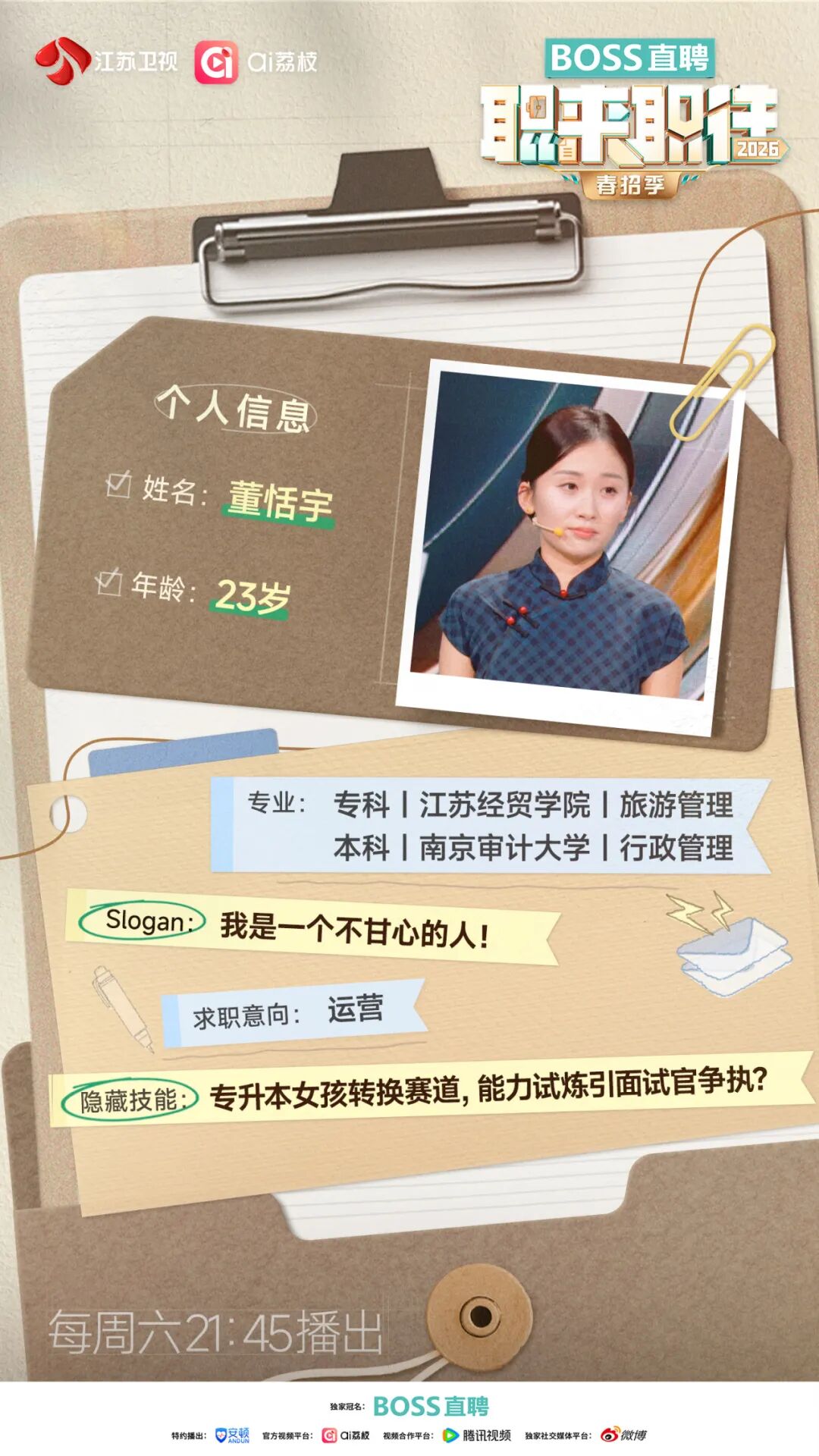 在政策持续助力青年就业的大背景下,个体职业选择与宏观发展导向同频共振。职场不仅是谋生的平台,更是实现个人价值、回应时代需求的舞台。明晚,《BOSS直聘·职来职往2026》春招季第三期节目,将继续聚焦“就业友好型发展”理念下的真实求职现场,呈现三位背景、路径迥异的年轻人如何直面机遇与挑战。