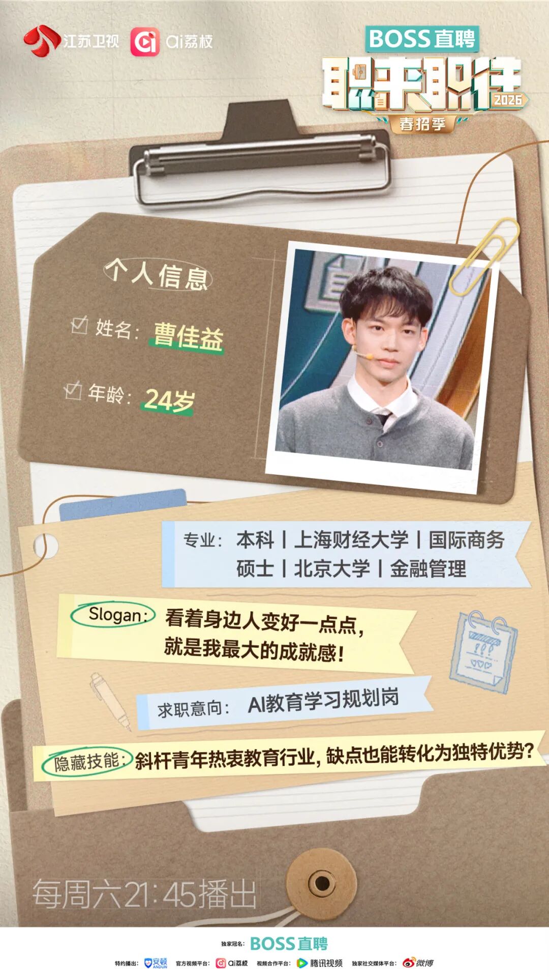 从跨界探索到扎实转型,从理论分析到实践深耕,他们的故事关乎一份工作,更映照出一代青年在时代浪潮中的思考、坚持与突围。节目将见证他们如何“勇敢表达,直接对话”,在直面16位企业面试官的碰撞中找到属于自己的职业定力。