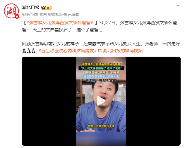张雪峰女儿@张姩菡Elle 发文回复:谢谢叔叔,我爸爸很伟大,他们说天上的文曲星换届了,选中了爸爸,引网友泪目。