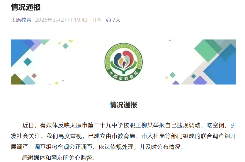 近日,有媒体反映太原市第二十九中学校职工柳某举报自己违规调动、吃空饷,引发社会关注。我们高度重视,已成立由市教育局、市人社局等部门组成的联合调查组开展调查。调查组将客观公正调查、依法依规处理,并及时公布情况。