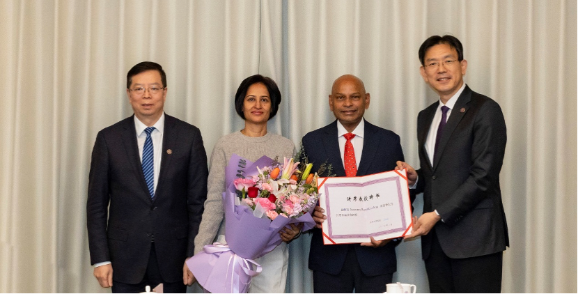 清华大学党委书记邱勇(左一)、校长李路明(右一)与西拉姆夫妇合影