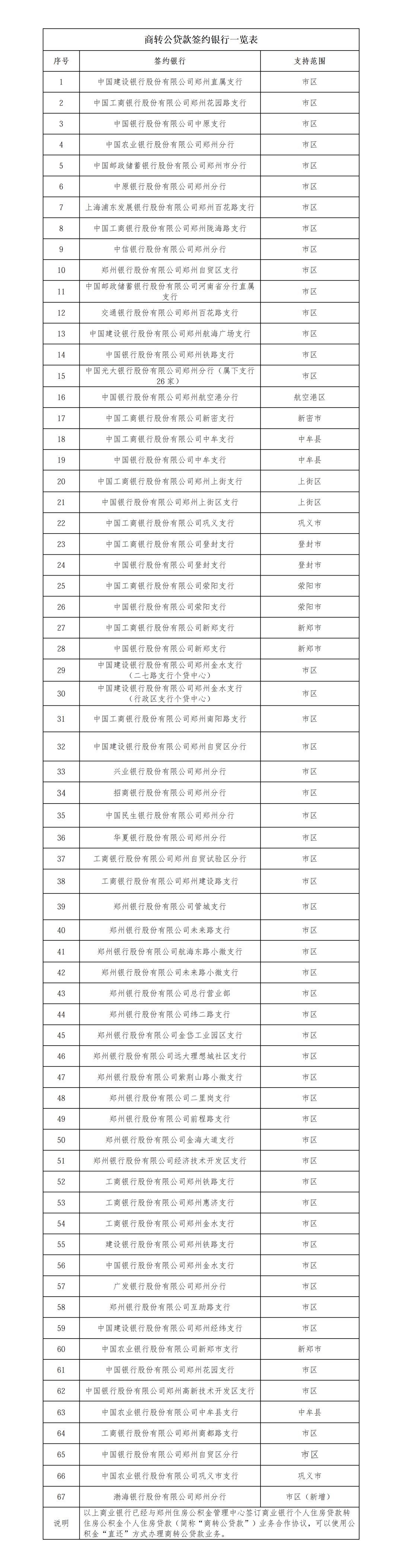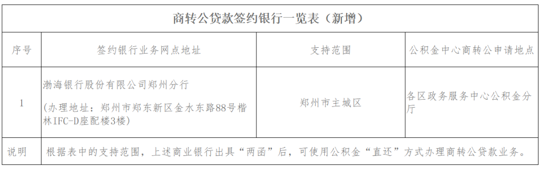 3月27日,郑州住房公积金管理中心发布通知,新增渤海银行郑州分行为“商转公贷款”签约银行,支持范围为郑州市主城区。至此,商转公贷款签约银行增至67家。