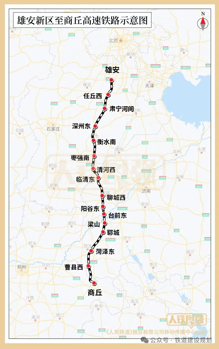 全线设雄安、任丘西、肃宁河间、深州东、衡水南、枣强南、清河西、临清东、聊城西、阳谷东、台前东、梁山、郓城、菏泽东、曹县西、商丘16座车站。其中,雄安和菏泽东2座车站为既有车站,梁山、郓城、商丘3座车站为改扩建车站,衡水南等11座车站为新建车站。