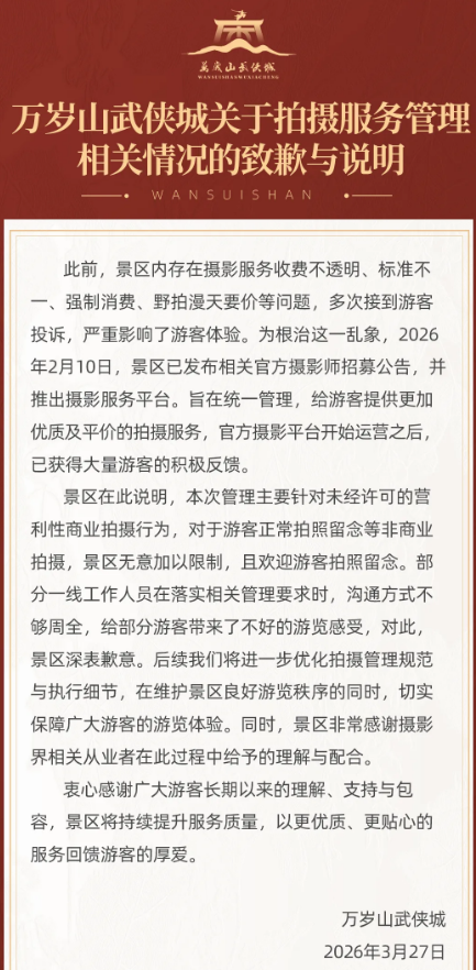 3月27日,万岁山武侠城发布《关于拍摄服务管理相关情况的致歉与说明》,文中表示,此前,景区内存在摄影服务收费不透明、标准不强制消费、野拍漫天要价等问题,多次接到游客投诉,严重影响了游客体验。为根治这一乱象,2月10日,景区已发布相关官方摄影师招募公告,并推出摄影服务平台。本次管理主要针对未经许可的营利性商业拍摄行为,对于游客正常拍照留念等非商业拍摄,景区无意加以限制,且欢迎游客拍照留念。部分一线工作人员在落实相关管理要求时,沟通方式不够周全,给部分游客带来了不好的游览感受,对此景区深表歉意。