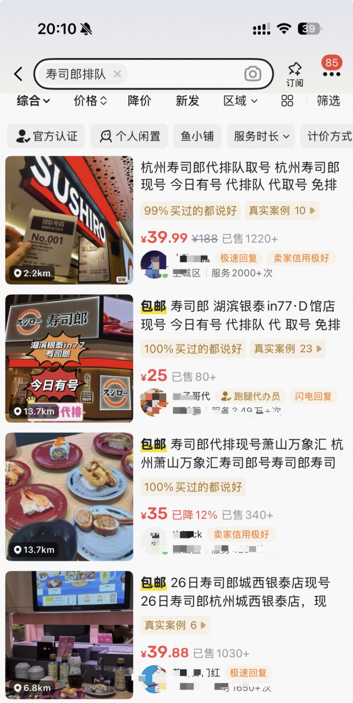 二手交易平台显示,寿司郎“代排队”价格普遍在30元-50元不等。有些价格甚至达到150元-300元。