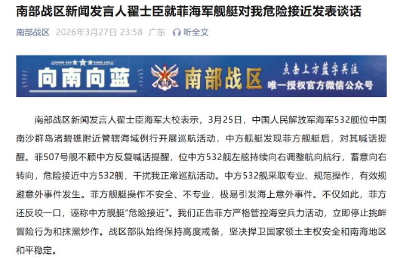 据新华社消息,南部战区新闻发言人翟士臣海军大校表示,3月25日,中国人民解放军海军532舰位中国南沙群岛渚碧礁附近管辖海域例行开展巡航活动,中方舰艇发现菲方舰艇后,对其喊话提醒。