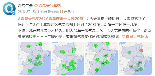 随着南风的回归,明天白天市区最高气温迅速回落到14℃,内陆地区气温变化不大,保持在21℃上下。