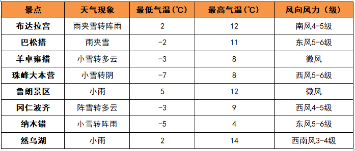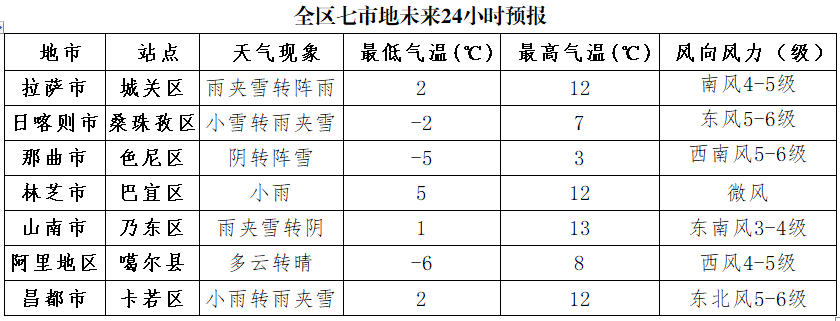 今日夜间:林芝和日喀则南部有小到中雨(雪),部分地方有中到大雨(雪),其中墨脱和波密高海拔地方有暴雪;山南、日喀则东部和北部、拉萨、昌都中部和北部、阿里东部阴天有小雪(雨)或雨夹雪,部分地方有中雪;其他地方多云。