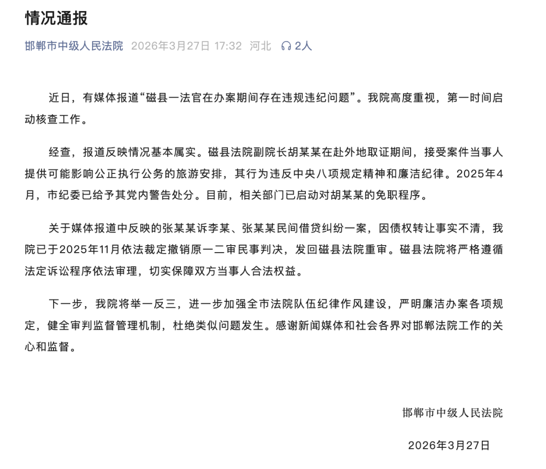 3月27日,邯郸市中级人民法院发布“情况通报”称,经查,报道反映情况基本属实。磁县法院副院长胡某某在赴外地取证期间,接受案件当事人提供可能影响公正执行公务的旅游安排,其行为违反中央八项规定精神和廉洁纪律。2025年4月,市纪委已给予其党内警告处分。
