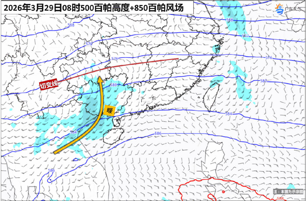 29-31日,暖湿气流加强,北方有冷空气南下,冷暖气流交汇形成的切变线逐渐东移南压,途经广东的中北部,给粤北和珠三角的中北部带来明显的强对流天气过程。