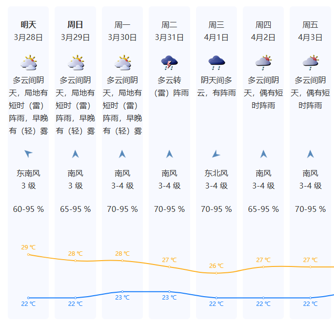 预计3月28日-30日大致多云,早晚有(轻)雾,间中局地有短时(雷)阵雨,28日气温22-29℃;