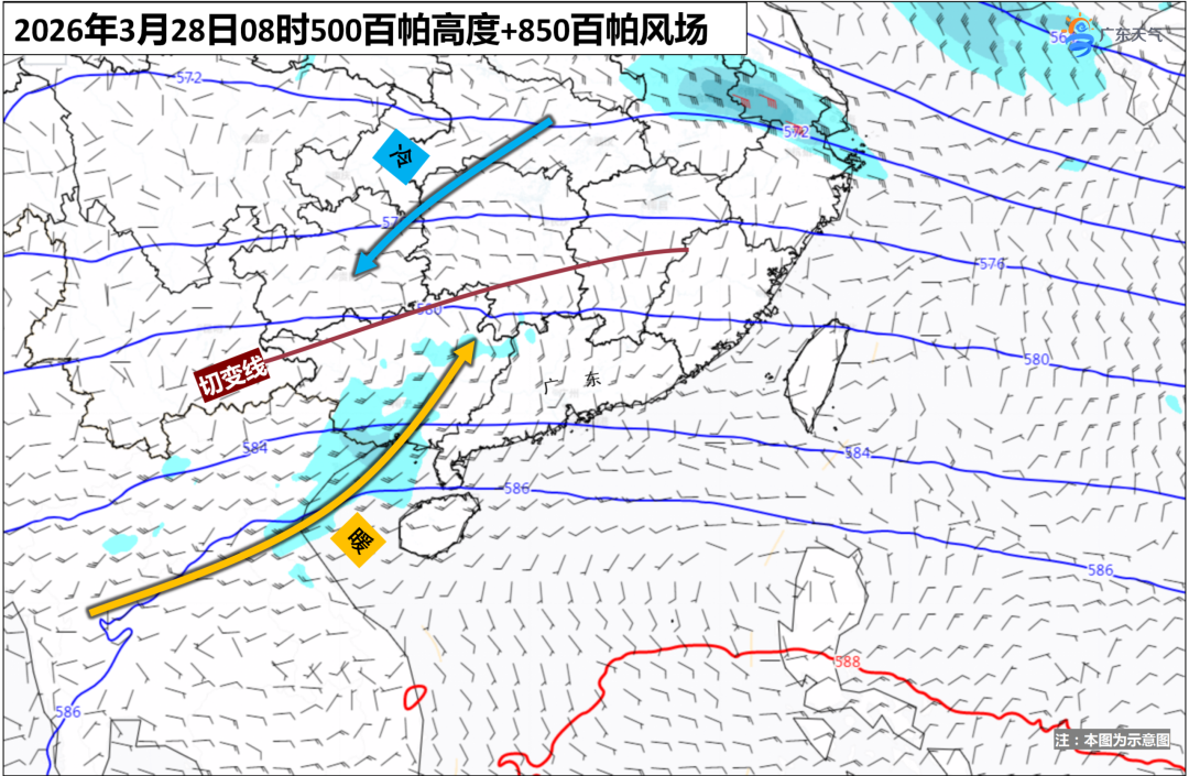 近期广东高温高湿,为强对流天气提供有利的热力条件。预计28日,冷暖气流在华南北部交汇,因此粤北地区多雷雨,其余地区也有阵雨出没。