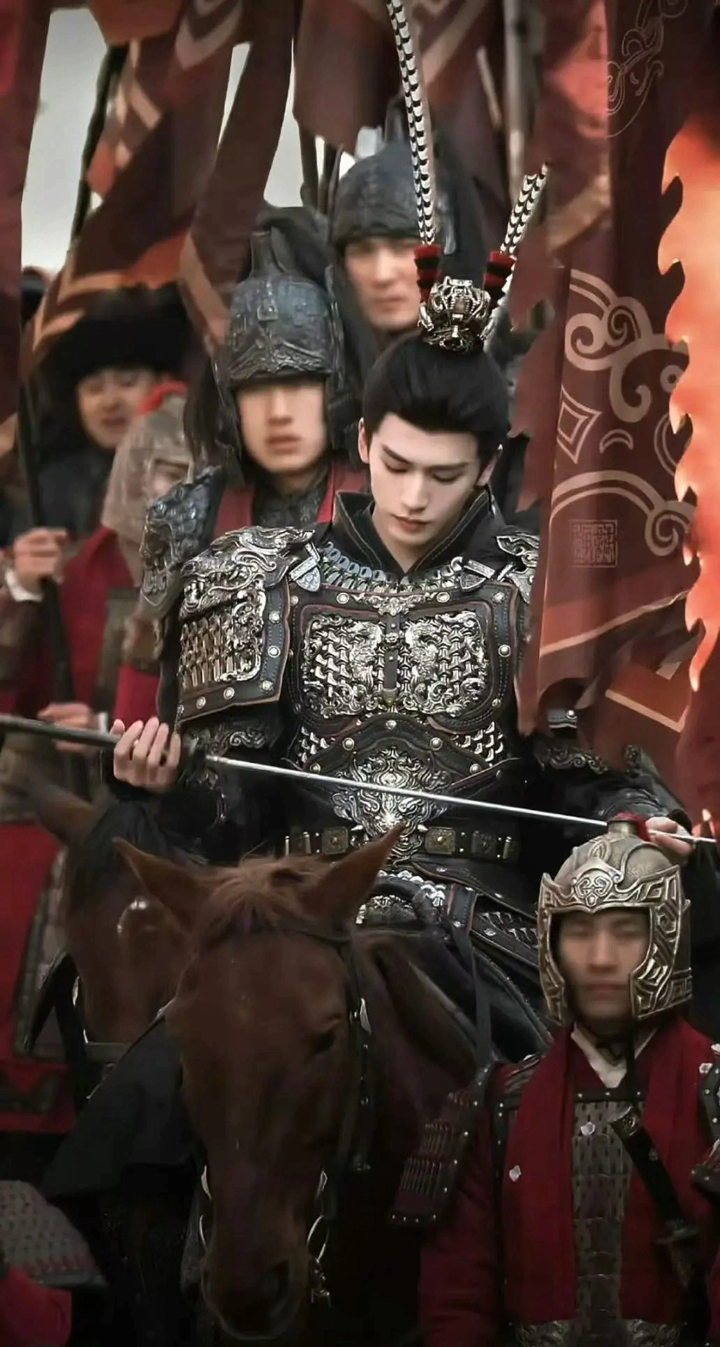 张凌赫饰演的武安侯谢征头戴雉尾翎。《逐玉》剧照