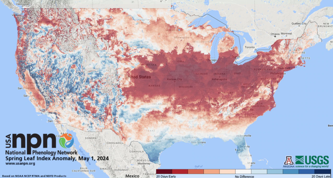 这张地图展示了2024年春季生物活动早于平均水平(红色区域)和晚于平均水平(蓝色区域)的分布情况。在春季开始得早的地区,花粉季会提前开始。来源:美国国家物候网络(USA-NPN)