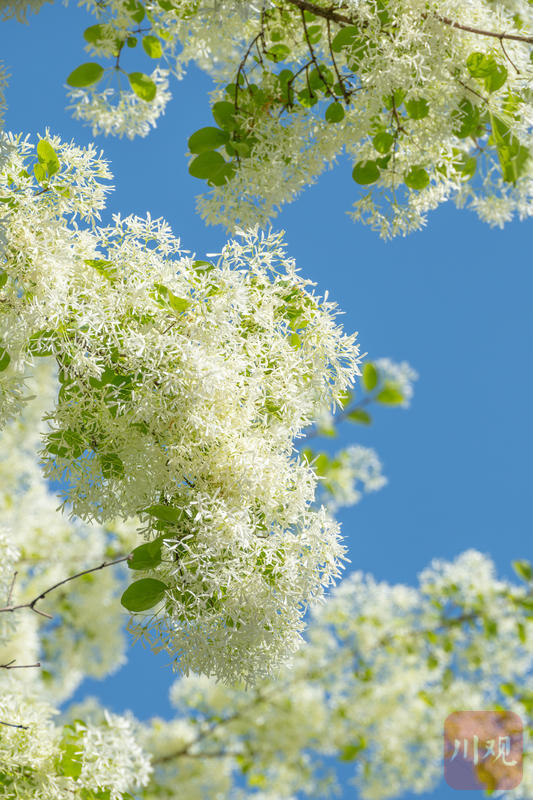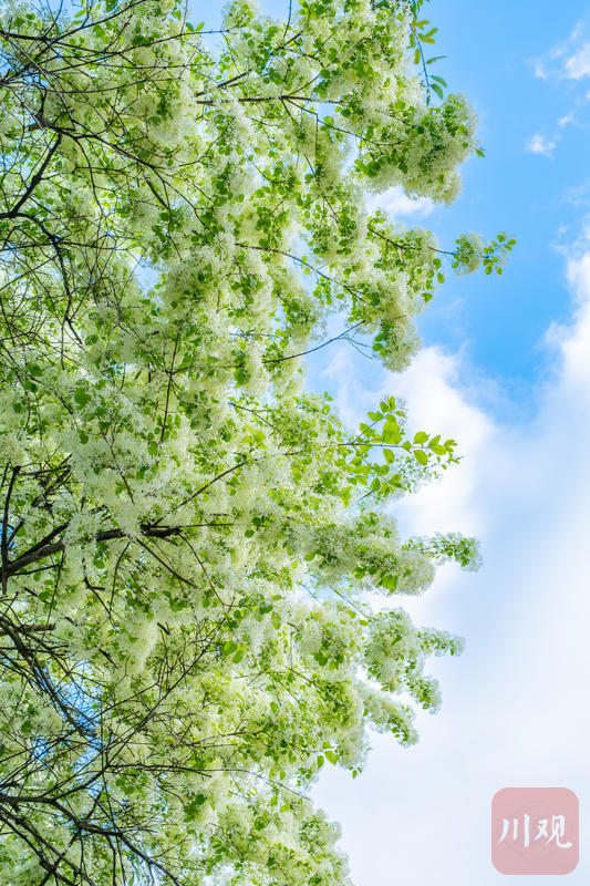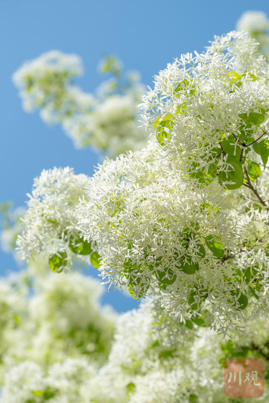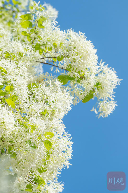 2026年3月26日,成都锦江区三圣花乡图南院,澄澈蓝天映衬满树素白,流苏花穗轻盈下垂,清新又治愈。